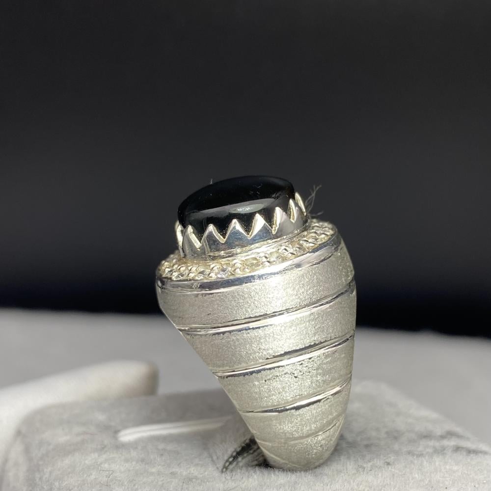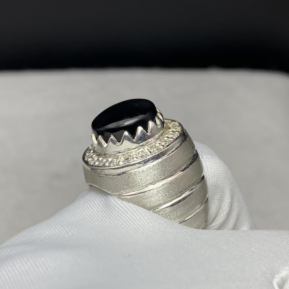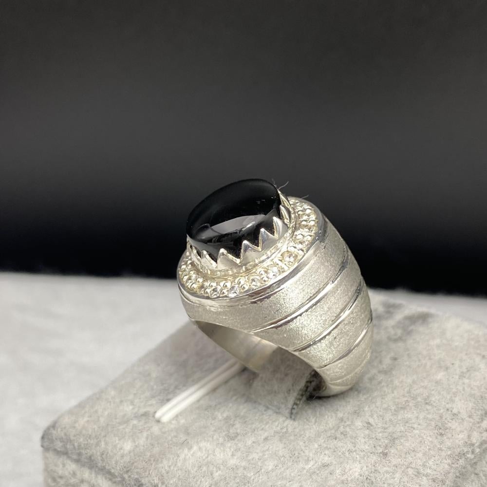 خاتم فضة بحجر جزع يماني قص دائري موديل اسطنبولي مع دق الماس مميز صياغة ورشة الرفاعي